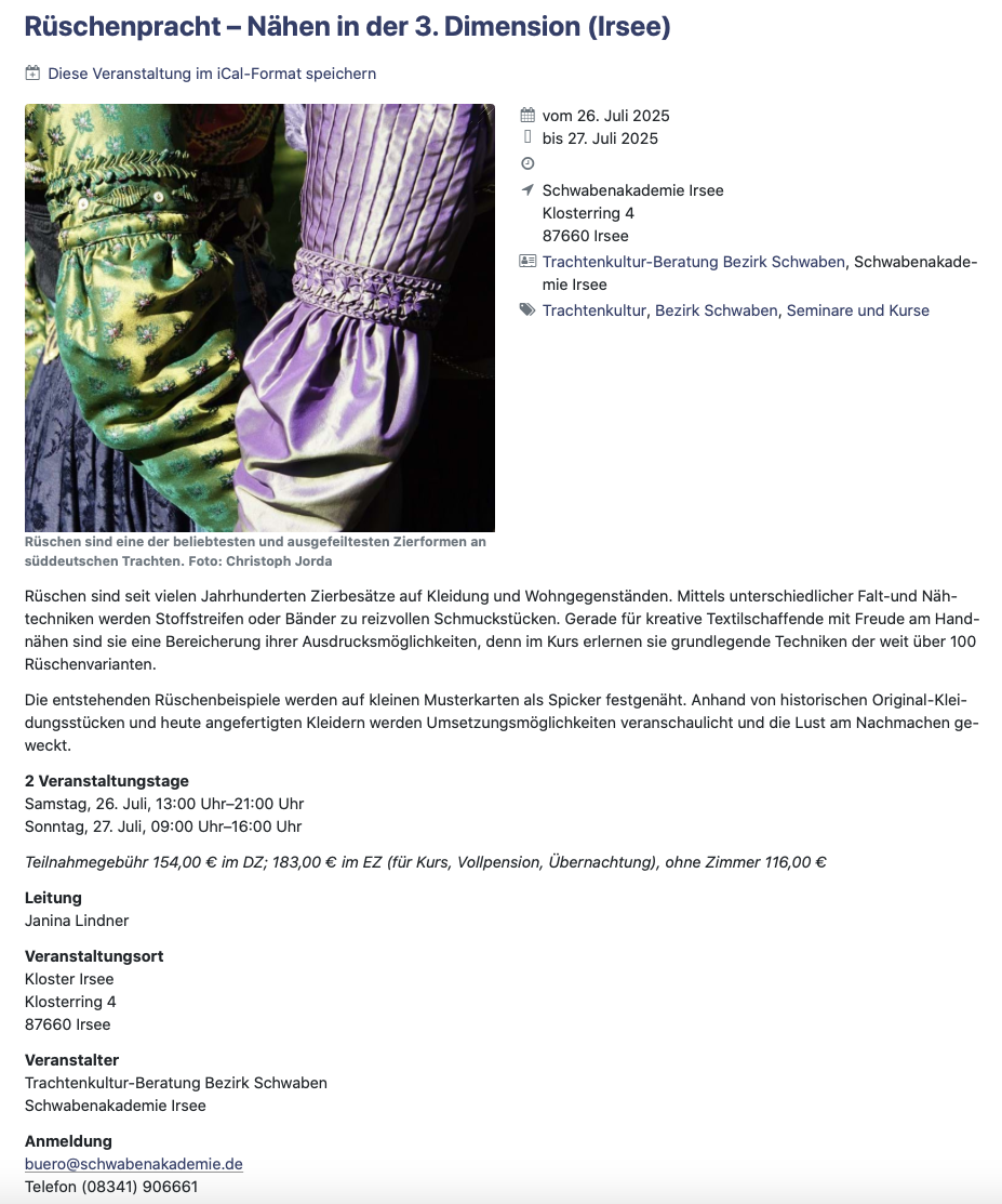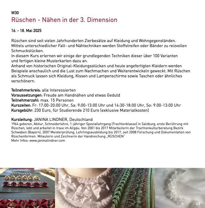 Mit der neuen Werkwoche bieten wir eine neue und in- tensive Form der Fortbildung an: In sieben thematisch gegliederten Kursen wird der kreative und sachgerechte Umgang mit einer Schatzkiste an Wissen um historische Kleidungsformen im Rahmen von Meisterkursen geöffnet für diejenigen, die tiefer in handwerkliche Details bzgl. Trachten einsteigen wollen.